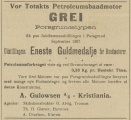 For å være sikker paa, at alle Børnesygdommene var helt overvundet, ventede Firmaet med Salg af "Grei" til Høsten 1906; den er udstillet en Gang, nemlig paa Risør Udstillingen 1905, hvor den ble belønnedes med Sølvmedalje. Der er senere foretaget flere Forbedringer med den. Firmaet fik ved samme Udstilling Foreningen for Fremme af de norske Fiskeriers store Sølvmedalje for Fortjenester af de norske Fiskerier. Foruden Motorer leverer Værkstedet forskjellige Spil og Indhaling af Ankere og Garn; disse kan drives af Motoren og ogsaa for disse Spil fik Firmaet Sølvmedalje i Risør. Firmaet har Agenter langs hele Kysten og paa flere Steder mindre Reparations Verksteder til hjælp for dets Montører. Foruden til almindelige Fiskefartøier har Verkstedet ogsaa levert Motorer til adskillige Bottelnosefiskere - op til 20 HK. - og med udmerkede Resultater. Af "Grei2 Motoren er der allerede solgt adskillige til forkjellige oversøiske Lande.
