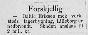 1919 - Baltic Eriksen opplevde brann i lageret.