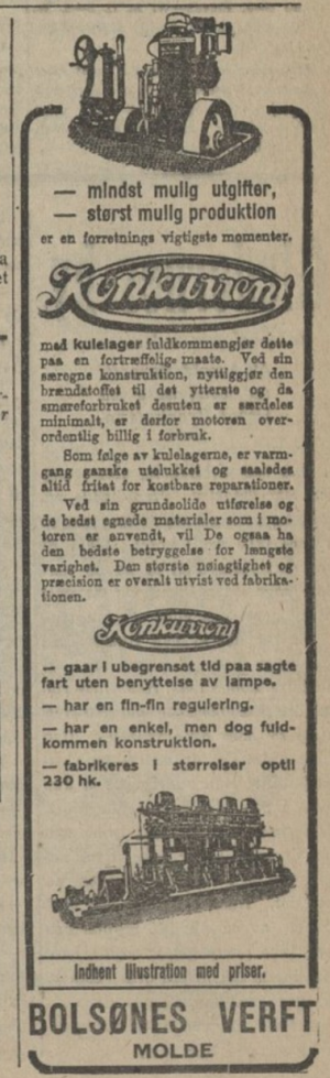 Ved Bolsønes Mek. Verksted ble det produsert 2-takt glødehodemotorer med 1, 2 og 4 sylidre, fra 3 til 300 HK. Flere motorer hadde "Konkurrent - Molde - Norge" innstøpt på fremsiden av svinghjulet. I begynnelsen var de mindre motorene utstyrt med vekesmøreapparat festet til fremsiden av sylinderen. Senere ble enkelte motorer utstyrt med trykksmøring (ikke Bauer-Nilsen).
