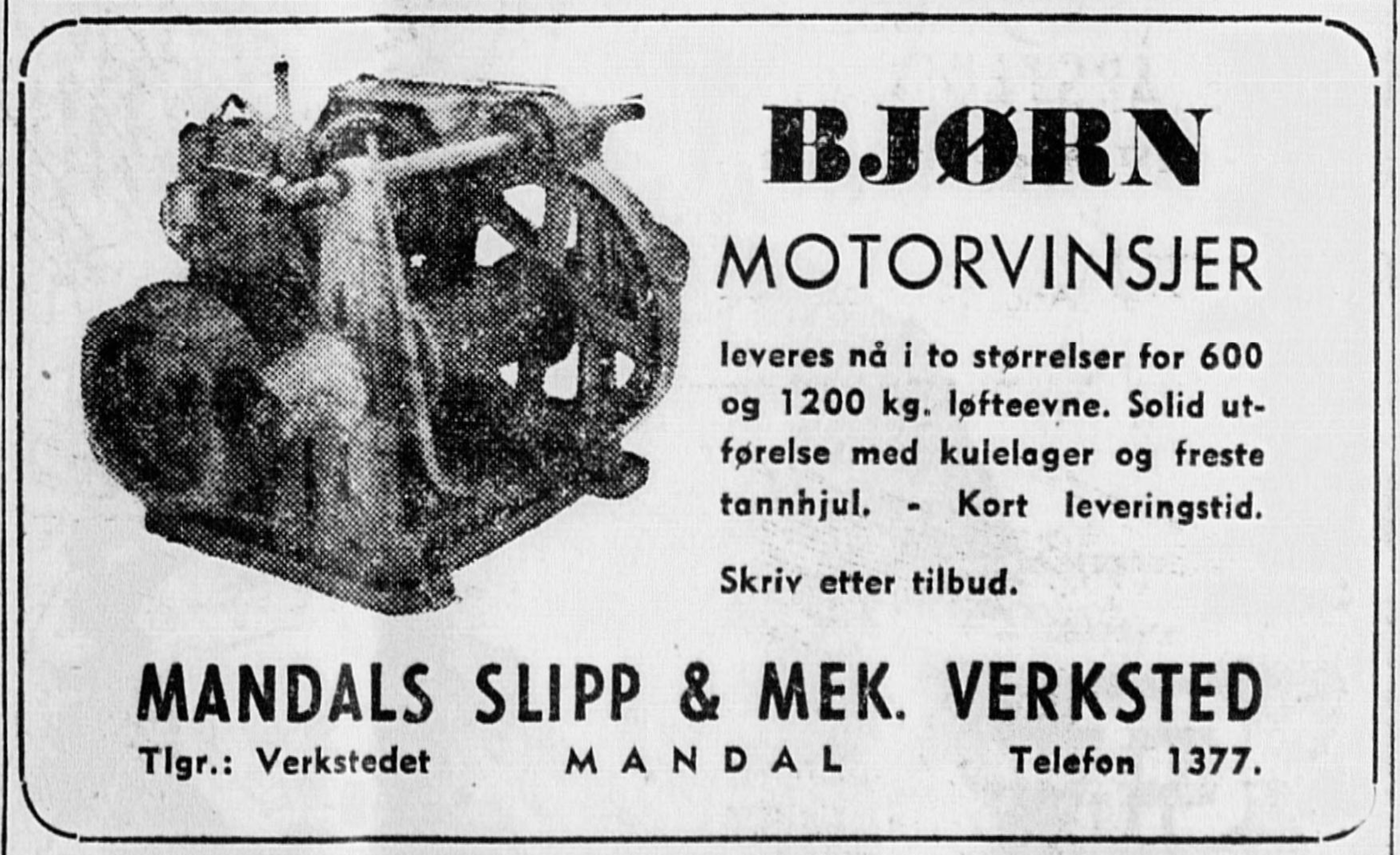 Reklame fra 1952. Bjørn motorvinsjer