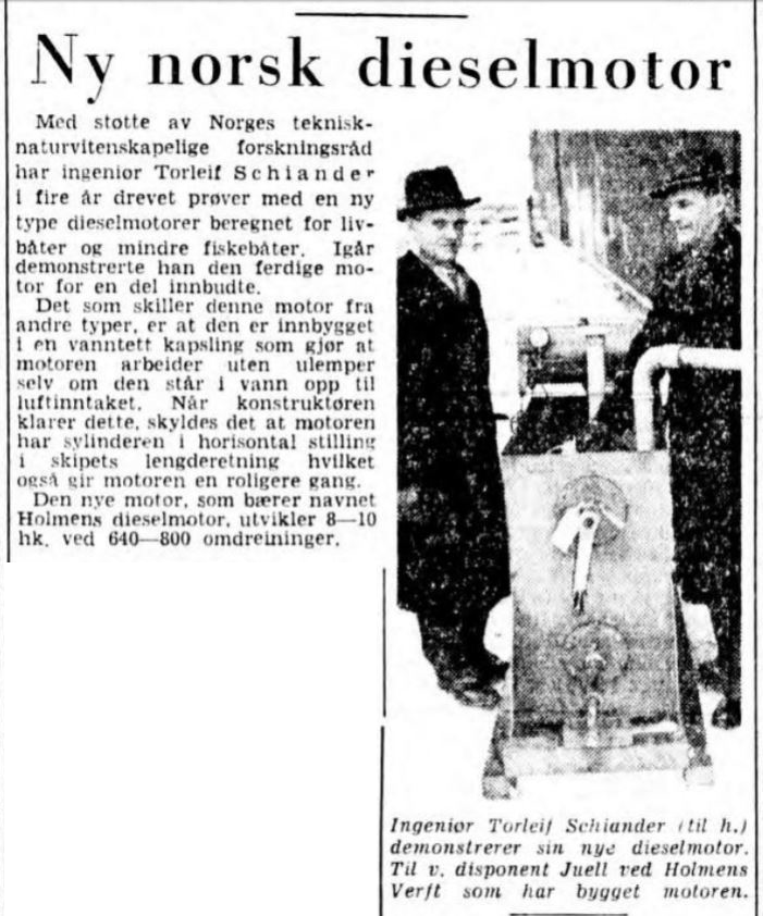 Avisartikkel om Holmens Verfts dieselmotor - Ingeniør Thorleif Schiander
