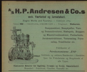 Verkstedet var en av de første motorprodusentene i Norge med motoren Eva. Deres første motoren var allerede i drift i 1902, omtrent samtidig med Ole Wejseths egen Eva-motor fra Bergen.