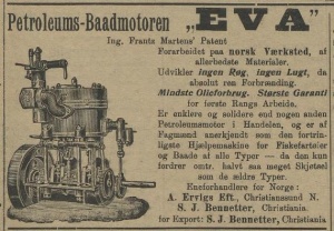 Med Petroleumsmotoren , Eva foretoges igaaraftes en Prøvetur, der varede i ca. 5 Timer, Hele denne tid og ligeledes nogle Timer tidligere paa Dagen arbeidede Motoren støt eg sikkert med den forudsatte Kraftudvikling. D'Hrr. P & A. Andresen & Co., paa hvis Værksted den er bygget, har ved denne Prøvetur bevist Motorens. Anvendelighed i Brugsbaade, idet den ved den igaar foretagne Tur var indsat i en solid 8-tons Skøite af Archertypen. Efter Prøveturen afgik Motorskøiten til Marstrandsudstillingen. Motoren ,,Eva", der er opfundet af Ingenjør Martens ved P. & A. Andresens Værksted, er den første Petroleumsmotor, der er opfundet i Norge. Efter hvad vi saa af den paa Prøveturen, staar den langt over de komplicerede udenlandske Petroleumsmotorer, Den arbeidede jævnt og støt, uden Lugt og med meget liden Støi. Skøiten, der er paa ca. 8 Ton og bygget som almindelig Brugsbaad, gjorde under Prøveturen ca. 5 1/2 a 6 kob. Med Storseil tilsat og en liden jævn Bris øgedes Farten til or 8 Mil.