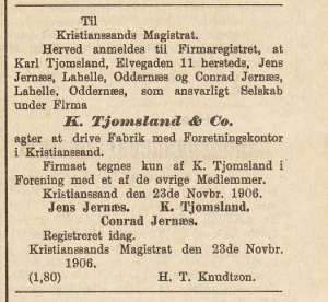 Grunnlagt av Karl Tjomsland i Høllen, Søgne i 1906 men flyttet raskt til Grimstad. Han hadde tidligere arbeidet som motorkonstruktør ved Høivolds Verksted i Kristiansand. Han sønn, Ole Tjomsland, konstruere den kjente Tjomsland-motoren i 1931.