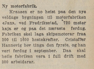 Fredrikstad Blad meddeler i dag, at et Aktieselskab, for endel bestaaende af Kristianiafolk, af Fredrikstad Kommute Har erhvervet 80 Maal fore Tomter, Hvorpaa der skal anlægges en Fabrik for Dieselmotorer, Automobiler og Flyvenmaskindele. Som administrerende direktør er ansatt en ung dansk ingeniør, Jan Hagemeister.