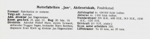 Fredriksstad kommune har til et stort nyt aktieselskap, som ogsaa omfatter Kristianiafolk, solgt en 80 maal stor fabriktomt ute paa Øren i Østre Fredriksstad. Tomten ligger utenfor det nu opførte kobberekstraktionsverk, og der maa ske en betydelig opfyldning av tomten før bygningen av fabrikken kan paabegyndes. Den er anslaat til at ville komme påa. omkring 200,000 kroner og vil være færdig ved nytaarstid 1918. Aktielskapet heter Motorfabrikken Jan og skal fabrikere dieselmotorer fra 100 til 800 h.k. samt automobiler og flyvemaskindeler. Fabrikkens administrerende direktør blir ingeniør Jan Hagemeister fra Kjøbenhavn, der har væretknyttet til den støre automobilfabrik ,Jan* i Kjøbenhavn, som tidligere. har anlagt en stor filialfabrik i Moskva. Den nye direktør har allerede sikret sig kontor her i byen og averterer nu efter personale samt materialer til driften, skr. ,Intell.
