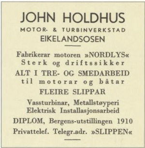 John Holdhus Motor & Turbinverkstad ble startet som en tav de første motorverkstedene i Hordaland i 1910. De drev også med elektrisk installasjon, og produserte turbiner for vannkraft.