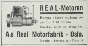 "Startet sin virksomhet i Ålesund året 1920, men flyttet i 1923 til Oslo. Til sine nåværende lokaler, hvor den driver fabrikasjon av sitt rikholdige i typer og størrelser vesentlig 4 takts motorer for maritim og stasjonær drift. Real-Motoren har magnettenning og kan kjøres på såvel parafin som bensin i et et rikt utvalg av i størrelser.