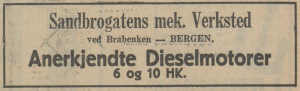 Reklame for Sandbrogatens mek. Verksted fra 1936