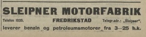Den første motoren Sleipner produserte var en 4-takt 3,5 Hk etter danske maler, med "snøfteventil" på innsuget. Det ble laget omtrent 20 motorer i 1908 og det samme i 1909. Motorene ble solgt hovedsakelig til små lystbåter og fiskebåter. Etter hvert som Sleipner ble mere kjent rundt om økte etterspørselen, og det ble klart for eierne at de måtte utvide fabrikken.