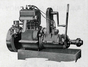 3,5HK: 1-sylindret, 4-takt bensinmotor med helstøpt sylinder og ventiler på styrbord side.