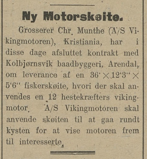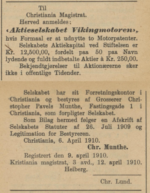 Vikingmotoren A/S finnes oppført i noen adressebøker og registre, som produsent av motoren Viking. De er oppført med adresse i Kirkegata 9. Der lå også endel bilvirksomhet på begynnelsen av 1900-tallet, blandt annet Norges første bilimportør, Bertel O. Steen.